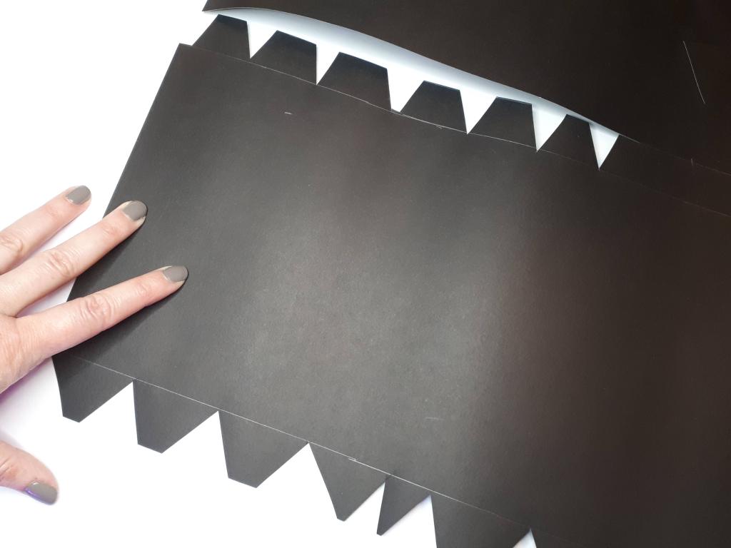 4. Make the long cylindrical section. Now you need your bristol board. The height of this part should be about 6.5 inches when complete, plus half an inch on either side to make the above shown tabs, so cut it 7.5 inches tall. The length will depend on how big your hat needs to be, so go ahead and roll up the bristol board and push it through your brim hole. The ends should overlap about an inch, two to be safe. Once that long strip is cut off use a ruler to draw a pencil line half an inch from each long side of the bristol board. Then cut the notches in as you see above. To make the next step simpler cut right to the line and no further.