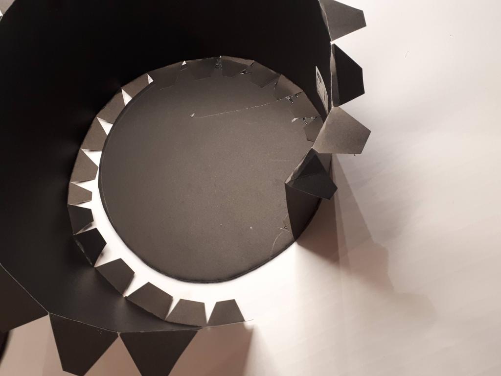 5. One side of notches will attach to the brim, and the other to the top. Fold one set of notches up, and the other down. This should be fairly simple to do if you were careful to cut your notches to the pencil line.