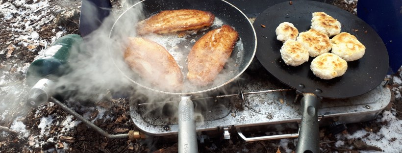 Setting: It was a snowy, but fairly mild day, with the sun shining down on us. We gathered around the fire and I cooked a lunch of fish and bannock over the camp stove. I had high hopes of cooking over the fire, but that was a bit too much.