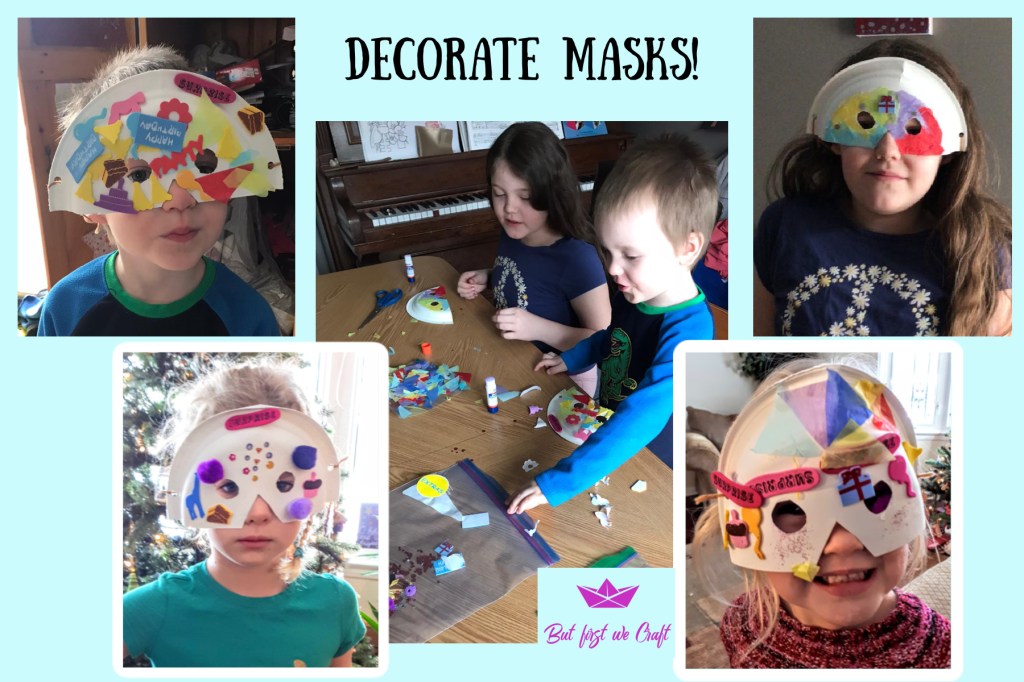 It’s just half of a paper plate with eye and nose holes cut out. Then I tied on some string by punching holes in the sides. The kids stuck onto their masks whatever they wanted, like stickers, tissue paper pieces, glitter and pom-poms. My son (not pictured) had feathers on his!