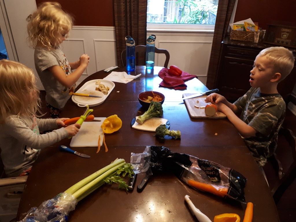 5. Lastly, toss your vegetables in the middle of the table (pre-washed), along with the vegetable peelers, etc. and sit around and chat while peeling and chopping the veg. Don’t they look so happy?!