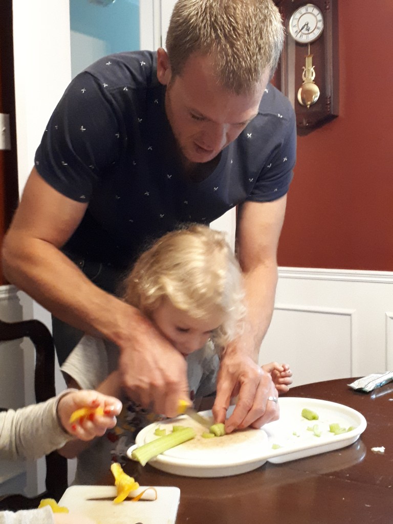 4. Give each person a cutting board and a knife. Be sure that your knives are age-appropriate, and that there is constant supervision. Nobody wants to end family time with a trip to the ER #beentheredonethat. We gave our three-year-old a toddler knife, but then also held her hands while she tried out a real paring knife.