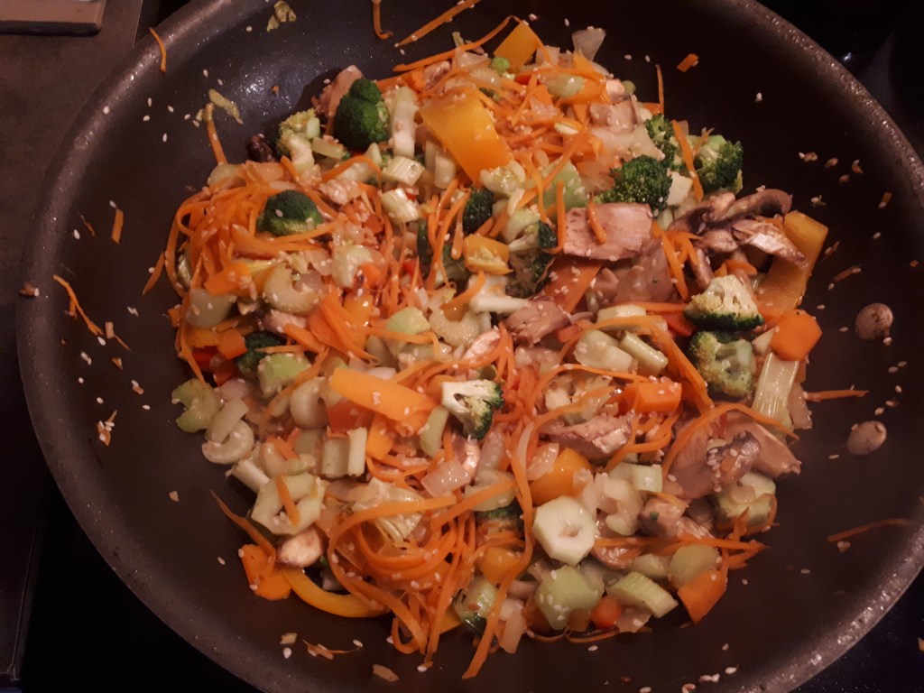 - Vegetables. We made a stir fry, so we had carrots, celery, broccoli, peppers and onion.