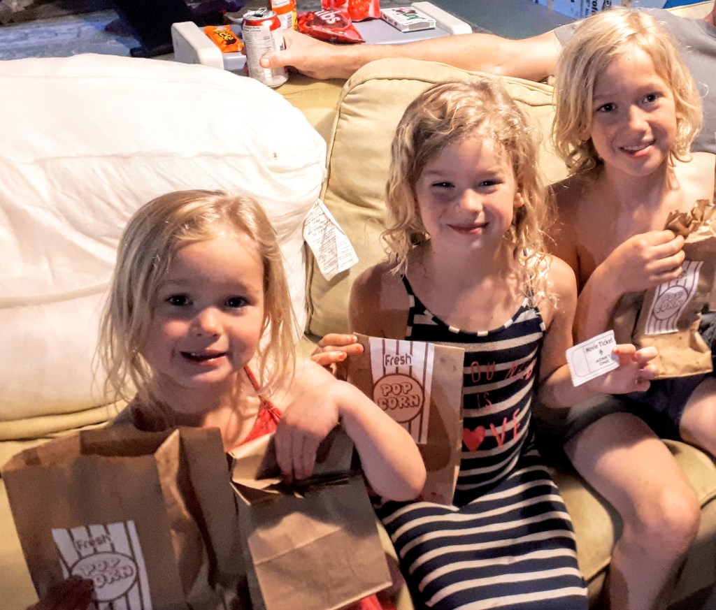 We saved the movie theatre until one of the last nights, and didn’t tell the kids we were doing it until it was time. Then we called them to come to the movies. They were so surprised, and loved it!